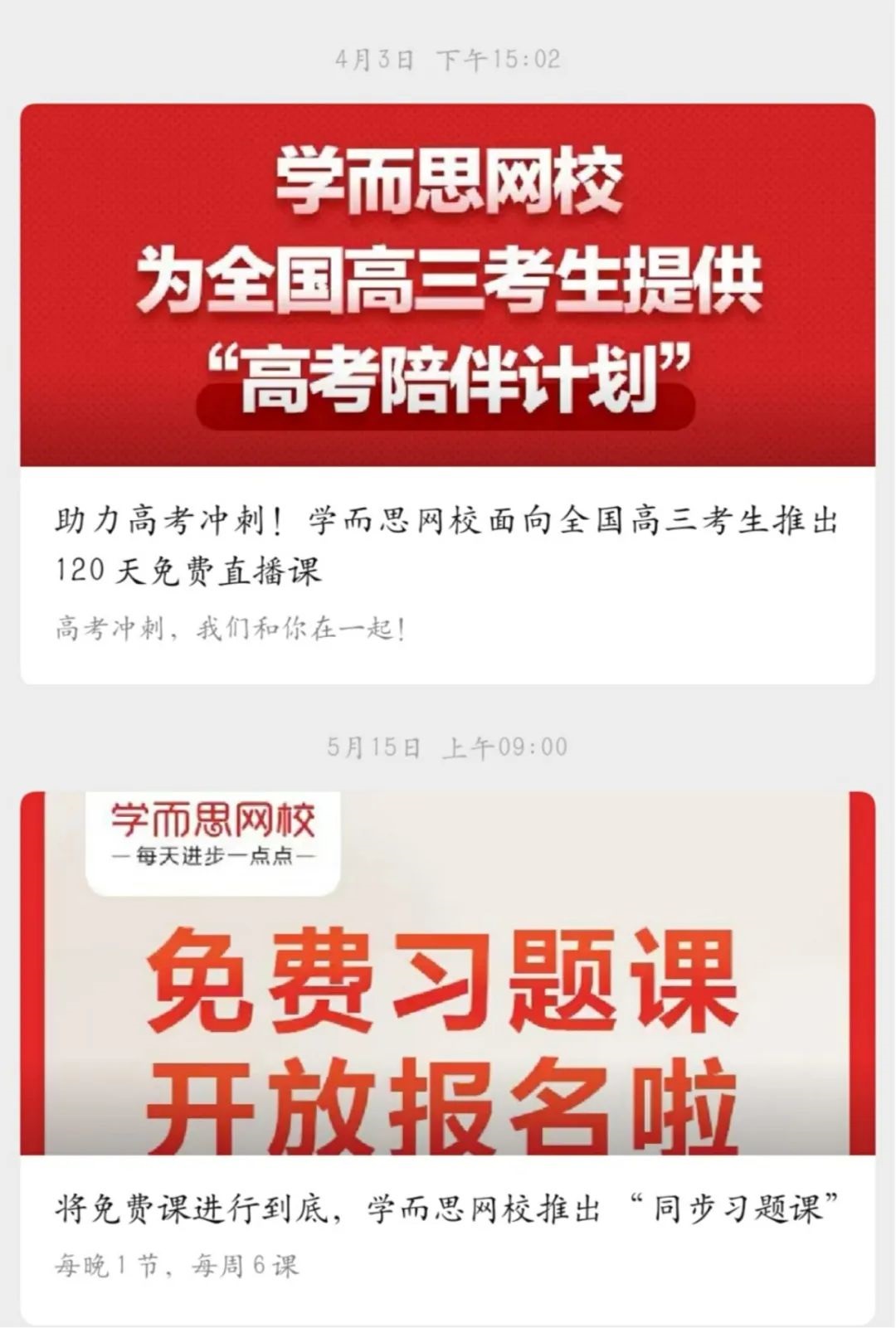 記者注意到,學(xué)而思網(wǎng)校在 4 月 3 日通過官方微信宣布面向高三學(xué)生推出 120 天免費直播課。緊接著,5 月 15 日又再次宣布 “將免費課進(jìn)行到底”,每周一到周六每天晚上開設(shè) 40 分鐘的同步習(xí)題課,覆蓋小學(xué)一年級到初中三年級。