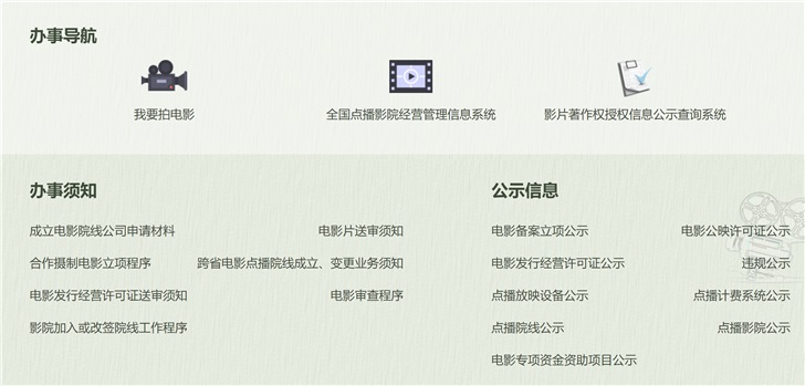 在國家電影局官網(wǎng)上,可以看到一些辦事導航,比如我要拍電影、全國點播影院經營管理信息系統(tǒng)、影片著作權授權信息公示查詢系統(tǒng)等。