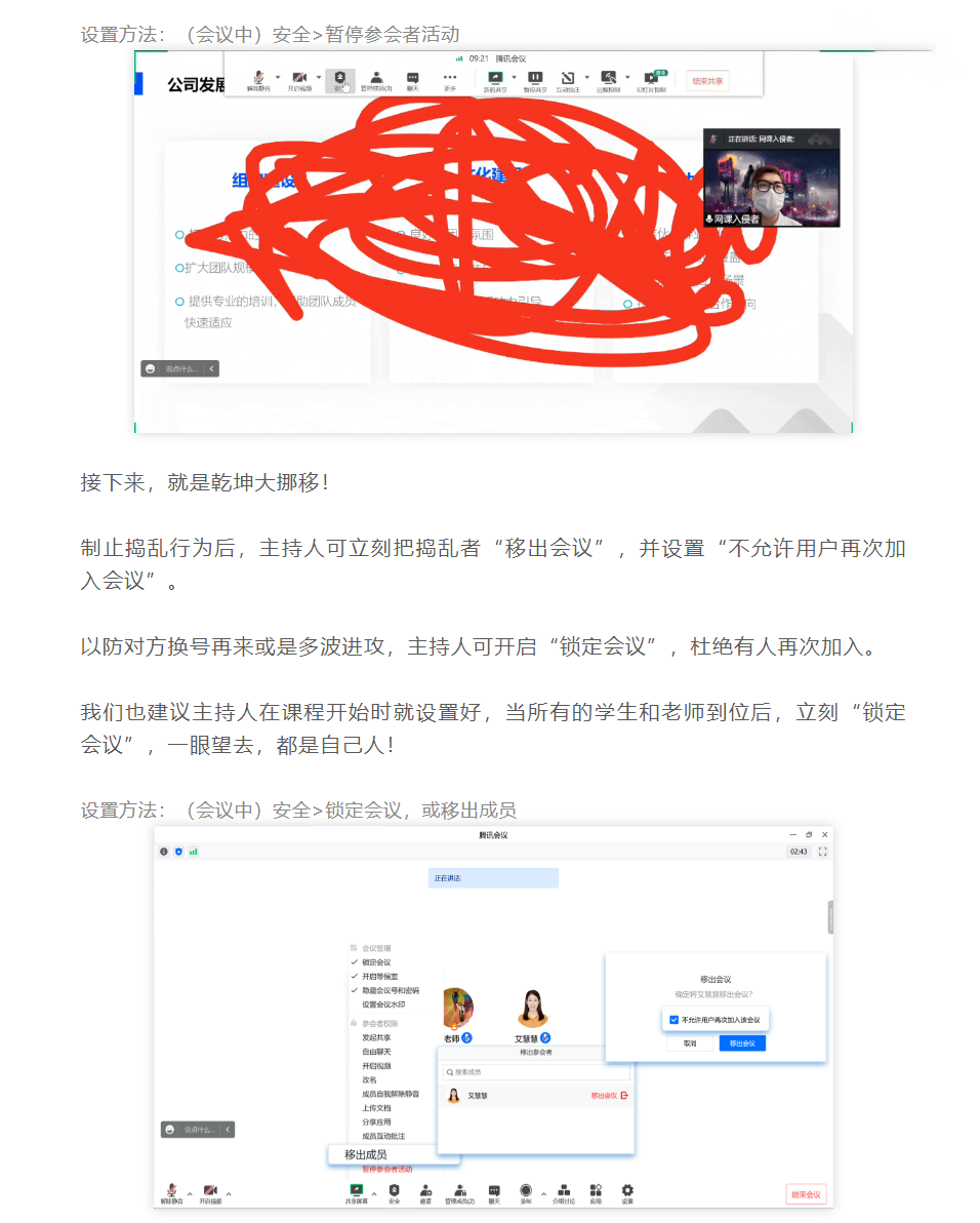 設(shè)置方法:(會(huì)議中)安全 > 鎖定會(huì)議,或移出成員。