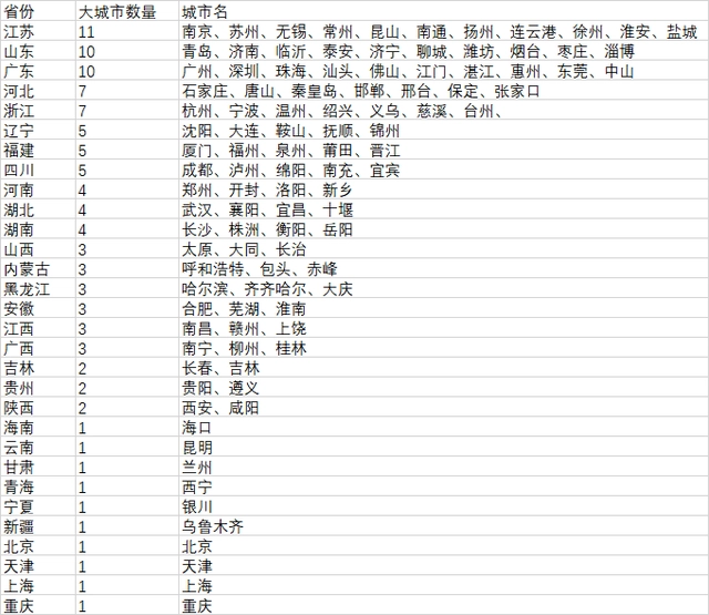 分省份來看,第二經(jīng)濟大省江蘇最多,達(dá)到11個,包括10個設(shè)區(qū)市和昆山這個縣級市,其省會城市南京的城區(qū)人口達(dá)791.5萬人,處于特大城市行列。