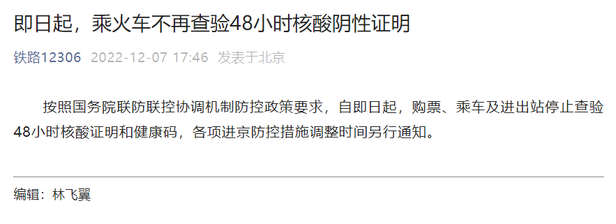 隨后,鐵路12306官方發(fā)布公告,按照國務(wù)院聯(lián)防聯(lián)控協(xié)調(diào)機(jī)制防控政策要求,自即日起,購票、乘車及進(jìn)出站停止查驗(yàn)48小時(shí)核酸證明和健康碼。