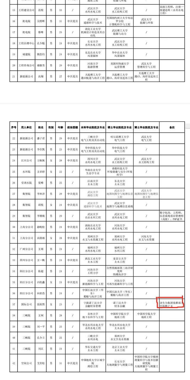 2023-02-08 14:29:07閱讀()大皖新聞2月7日,記者關(guān)注到,長(zhǎng)江設(shè)計(jì)集團(tuán)有限公司于2023年2月2日發(fā)布了長(zhǎng)江設(shè)計(jì)集團(tuán)2023年第三批擬聘人員信息公示,在公示表中記者看到該集團(tuán)國(guó)際公司招聘人員張欣然的公示信息中,專門備注“該生為集團(tuán)黨群部主任陳靜之女”。