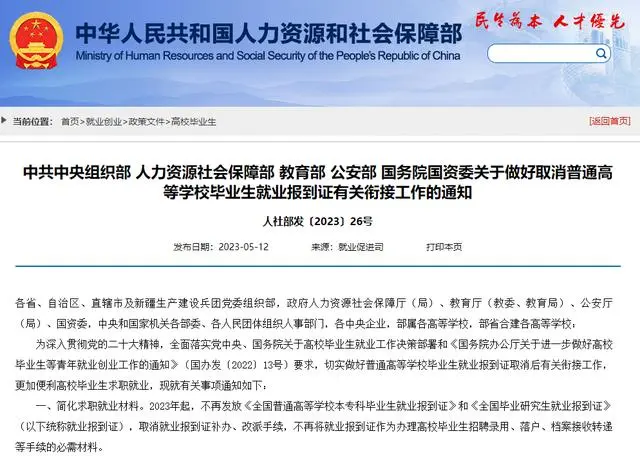 2023-05-13 09:47:19閱讀()人民政協(xié)網(wǎng)據(jù)人社部網(wǎng)站消息,日前中共中央組織部、人力資源社會(huì)保障部、教育部、公安部、國(guó)務(wù)院國(guó)資委發(fā)布《關(guān)于做好取消普通高等學(xué)校畢業(yè)生就業(yè)報(bào)到證有關(guān)銜接工作的通知》(以下簡(jiǎn)稱(chēng)《通知》)。《通知》明確,2023年起,不再發(fā)放《全國(guó)普通高等學(xué)校本專(zhuān)科畢業(yè)生就業(yè)報(bào)到證》和《全國(guó)畢業(yè)研究生就業(yè)報(bào)到證》(以下統(tǒng)稱(chēng)“就業(yè)報(bào)到證”),取消就業(yè)報(bào)到證補(bǔ)辦、改派手續(xù),不再將就業(yè)報(bào)到證作為辦理高校畢業(yè)生招聘錄用、落戶(hù)、檔案接收轉(zhuǎn)遞等手續(xù)的必需材料。