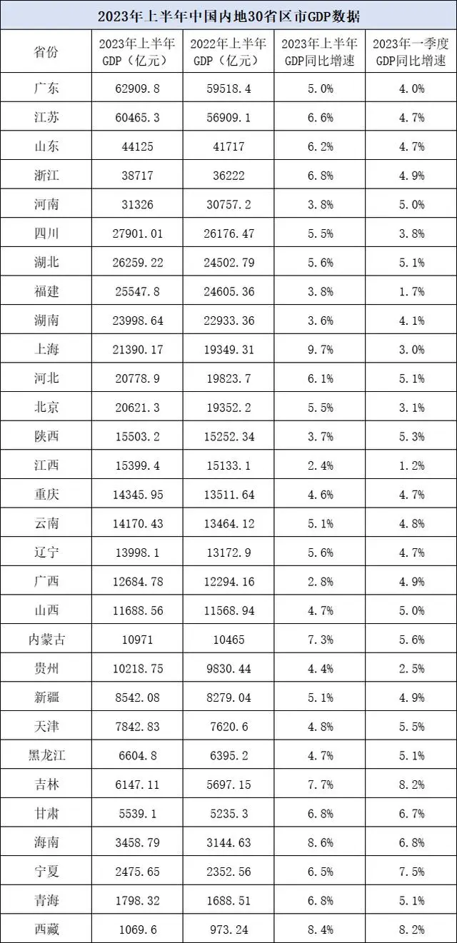 根據(jù)已經(jīng)發(fā)布的數(shù)據(jù),廣東、江蘇、山東、浙江、河南五省今年上半年GDP超過3萬億,分別為62909.8億元、60465.3億元、44125億元、38717億元、31326億元。四川、湖北、福建、湖南、上海、河北、北京處于2萬億梯隊,分別為27901.01億元、26259.22億元、25547.8億元、23998.64億元、21390.17億元、20778.9億元、20621.3億元。安徽盡管暫未發(fā)布上半年經(jīng)濟數(shù)據(jù),但GDP超2萬億且位居全國前十,應(yīng)無懸念。