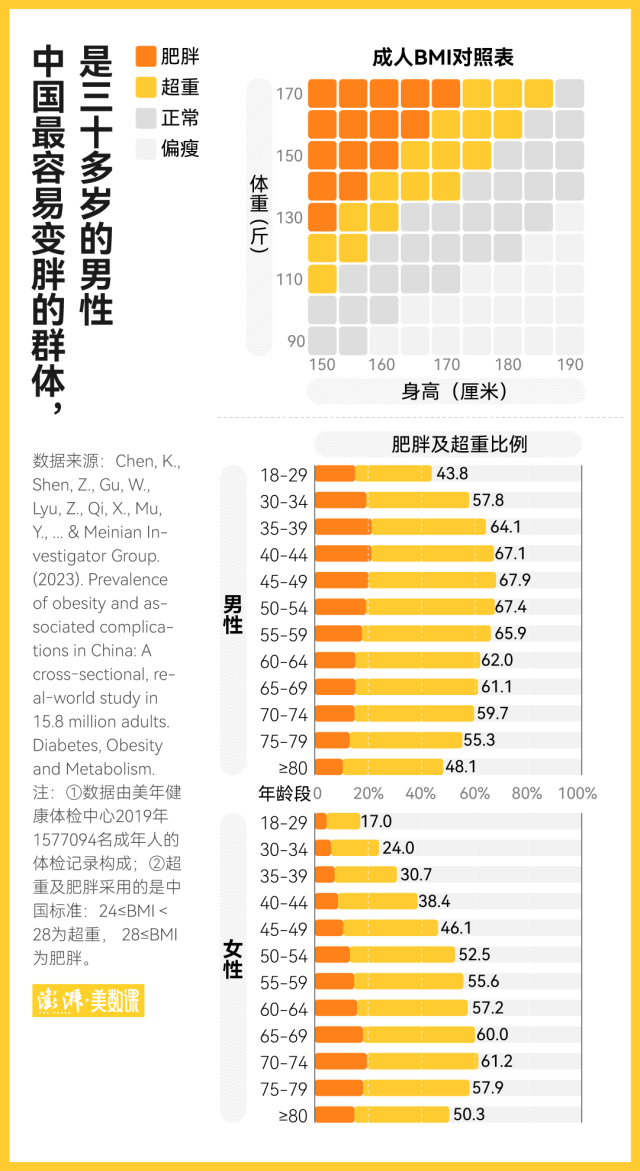 根據(jù)中國人的體質(zhì),成年人的 BMI 指數(shù)(體重(千克)/【身高(米)的平方】)分別達到 24 和 28 時,就是超重和肥胖。基于這一標準,近期發(fā)表于學術期刊《糖尿病、肥胖與代謝》上的一篇名為《中國肥胖患病率及相關并發(fā)癥:1580 萬成年人的橫斷面真實世界研究》論文,就統(tǒng)計出了中國的整體發(fā)胖情況:有 34.8% 的人超重,另外還有 14.1% 的人有更嚴重的肥胖問題。