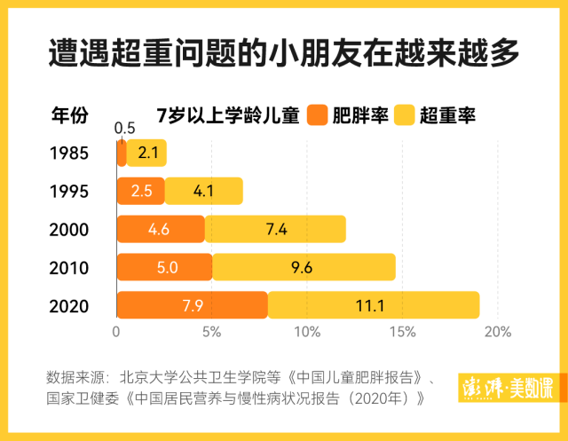 因此除了成年人,兒童的肥胖情況也同樣不容忽視。根據(jù)國家衛(wèi)健委在 2020 年發(fā)布最新一期《中國居民營養(yǎng)與慢性病狀況報告》,與 1985 年時,中國 7 歲以上學齡兒童超重和肥胖率僅 2.6% 比,現(xiàn)在的小朋友遭遇體重問題的比例也已經(jīng)上升到了 19.0%。