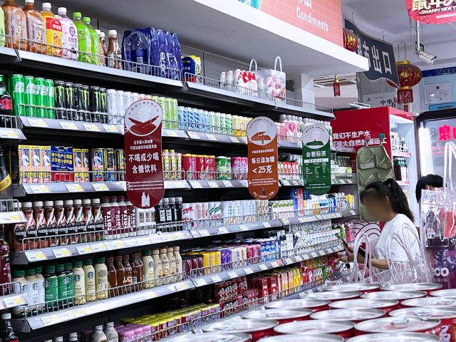 上海市嘉定區(qū)一超市內(nèi)懸掛了含糖飲料警示標識。