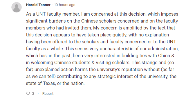 該員工還認(rèn)為,學(xué)校的舉動很奇怪,因?yàn)橹靶7竭€一直對與中國建立關(guān)系和邀請中國學(xué)生和學(xué)者來學(xué)校充滿興趣,而如今的舉動只會損害學(xué)校的聲譽(yù),同時(shí)也不會給學(xué)校的發(fā)展、以及得克薩斯州乃至美國的利益,帶來任何好處。