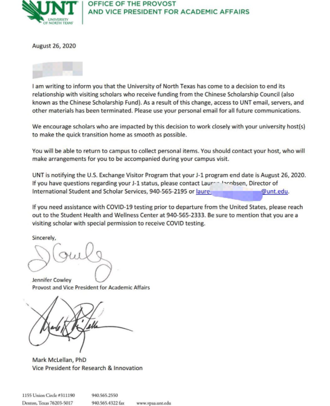 這封郵件截圖還顯示,該校也將此事告知了美國政府的相關(guān)簽證部門,表示這些中國公派訪問學(xué)生學(xué)者的學(xué)習(xí)項(xiàng)目已在8月26日當(dāng)天結(jié)束。