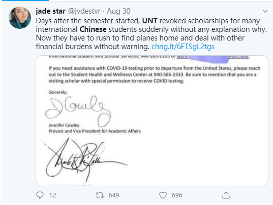 然而,從美國網(wǎng)絡(luò)上一些為該校中國留學(xué)生“鳴不平”的網(wǎng)貼來看,北得克薩斯州大學(xué)在做出這一決定前并沒有提前知會學(xué)生們,也沒有就為何這么做給出理由。