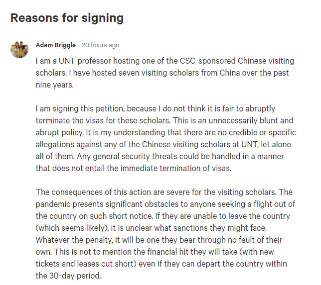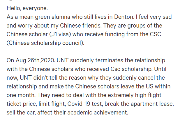 在美國請?jiān)割愋畔⒕W(wǎng)站“Change.org”上,一則為北得克薩斯州大學(xué)的中國留學(xué)生求助的網(wǎng)貼就表示,該校是在8月26日當(dāng)天突然宣布中止受中國國家留學(xué)基金委員會資助的訪問學(xué)生和學(xué)者的學(xué)習(xí)資格的,并要求這些持有J-1類簽證的中國公派留學(xué)生和學(xué)者在1個(gè)月內(nèi)離境??稍撔V两褚矝]有透露這么做的原因是什么。