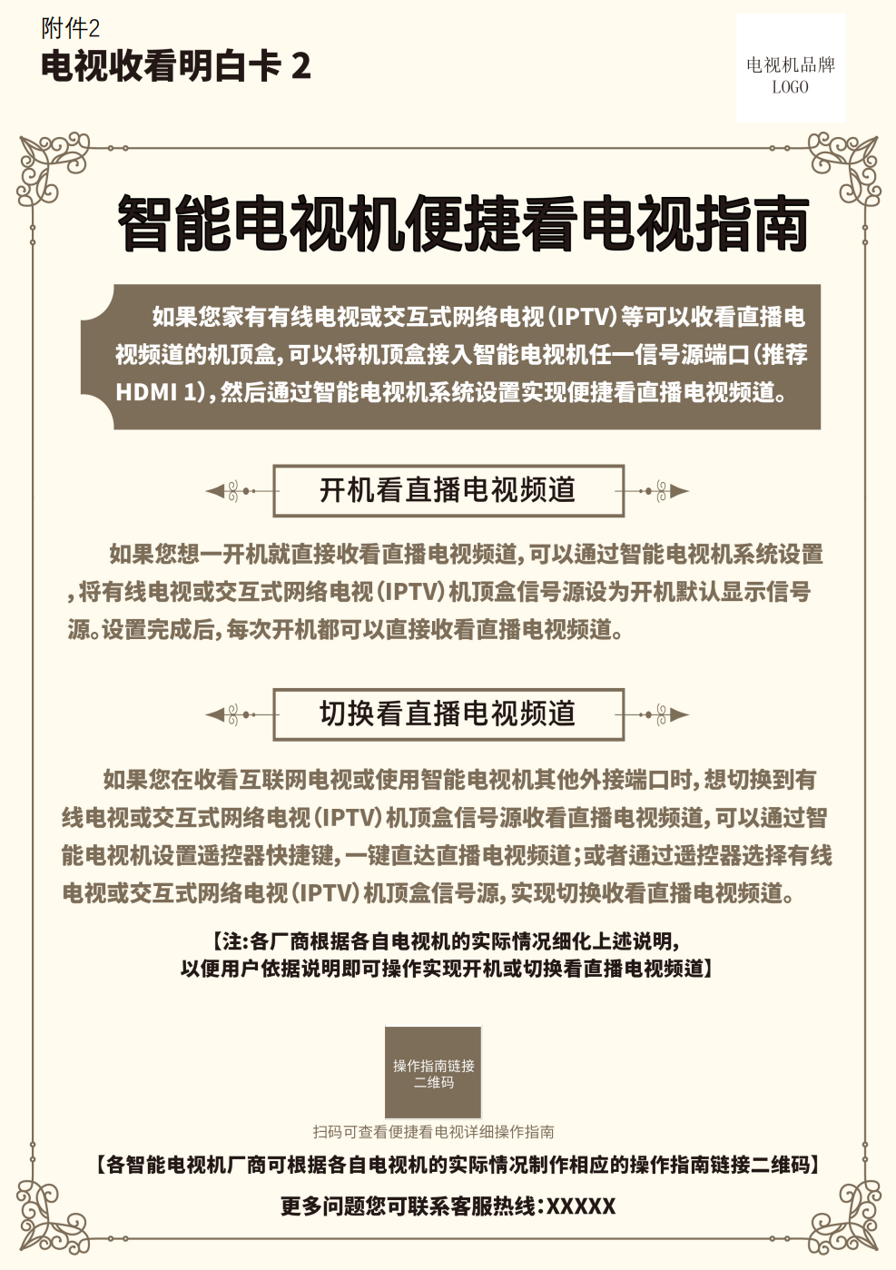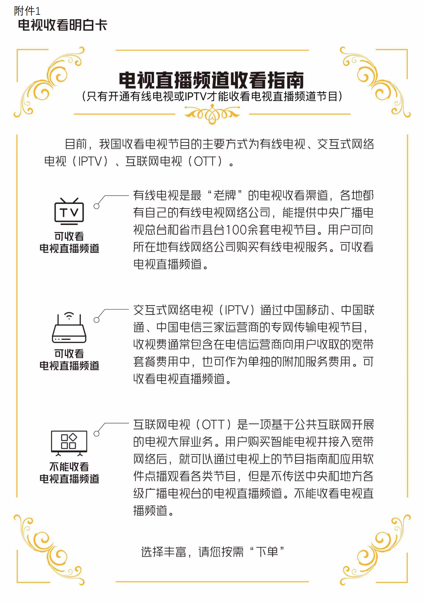 自2023年11月起,各電視機生產(chǎn)廠商要將制作完成的《電視收看“明白卡”》裝入電視機包裝箱內(nèi)的說明材料中,同時在電商銷售頁面、線下實體銷售和廠商入戶安裝電視機過程中,將“明白卡”內(nèi)容向用戶明確展示,并告知用戶只有開通有線電視或IPTV方可收看電視直播頻道節(jié)目。