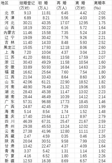 表:2022年31個省份結(jié)婚登記、初婚、再婚、離婚及離婚率數(shù)據(jù)(數(shù)據(jù)來源:《中國統(tǒng)計年鑒2023》)