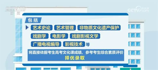 據(jù)了解,藝術(shù)類專業(yè)依據(jù)考生高考文化成績、專業(yè)考試成績,參考綜合素質(zhì)評價(jià)進(jìn)行招生錄取。此次藝考改革一個(gè)重要的變化是,部分藝術(shù)類專業(yè)不再組織專業(yè)考試,包括藝術(shù)史論、藝術(shù)管理、非物質(zhì)文化遺產(chǎn)保護(hù)、戲劇學(xué)、電影學(xué)、戲劇影視文學(xué)、廣播電視編導(dǎo)、影視技術(shù)等,將直接依據(jù)考生高考文化課成績、參考考生綜合素質(zhì)評價(jià),擇優(yōu)錄取。