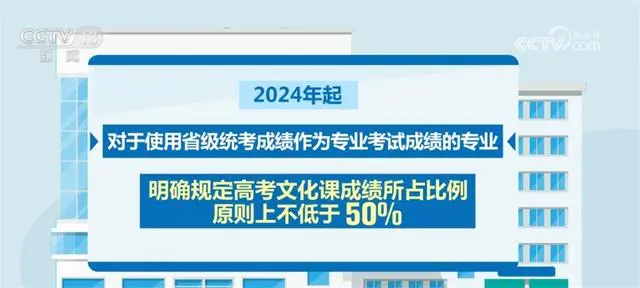 此外,2024年起,對于使用省級統(tǒng)考成績作為專業(yè)考試成績的專業(yè),明確規(guī)定高考文化課成績所占比例原則上不低于50%。同時(shí),鼓勵(lì)??几咝=Y(jié)合專業(yè)培養(yǎng)要求,進(jìn)一步提高考生高考文化課成績錄取要求。