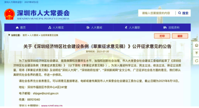 近日,深圳市人大常委會社會建設(shè)工委組織起草了《深圳經(jīng)濟特區(qū)社會建設(shè)條例(草案征求意見稿)》(以下簡稱為《草案》),共五章七十三條細則, ...