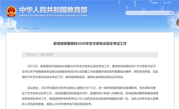教育部:鼓勵藝考生網(wǎng)上提交作品與面試