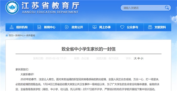 日前,江蘇省政府決定,全省各級各類學校(高校、中小學、幼兒園、托兒所等)2月17日前不開學,嚴禁培訓機構在開學前開展線下集中培訓活動。 ...