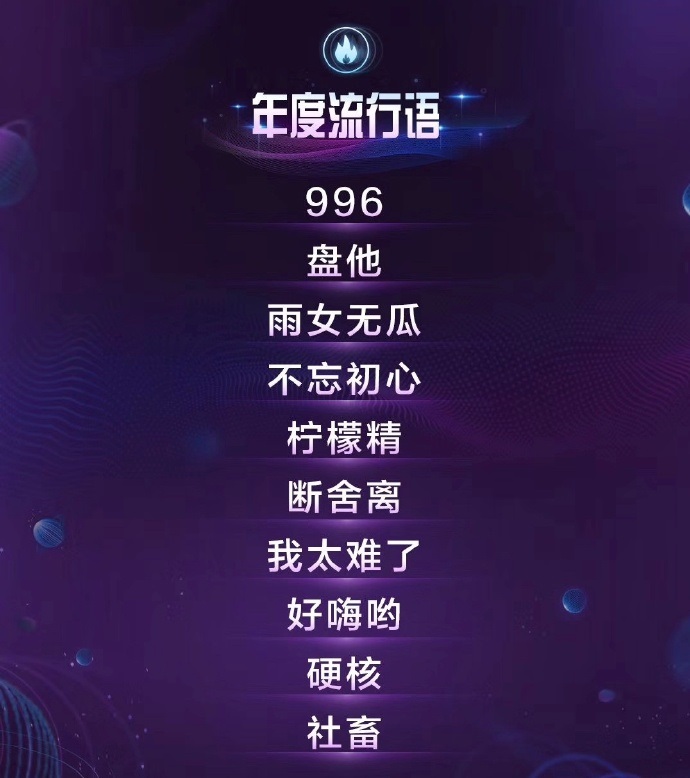百度沸點公布了2019年度十大中文搜索流行語,996、盤他、雨女無瓜、不忘初心、檸檬精、斷舍離、我太難了、好嗨呦、硬核、社畜上榜。其結(jié)果 ...