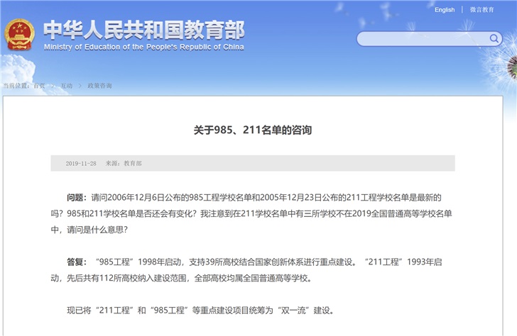 近期中國教育部網(wǎng)站做出了關于985、211名單的咨詢,解答中表示,現(xiàn)已將211工程和985工程等重點建設項目統(tǒng)籌為雙一流建設。關于985、211名單 ...