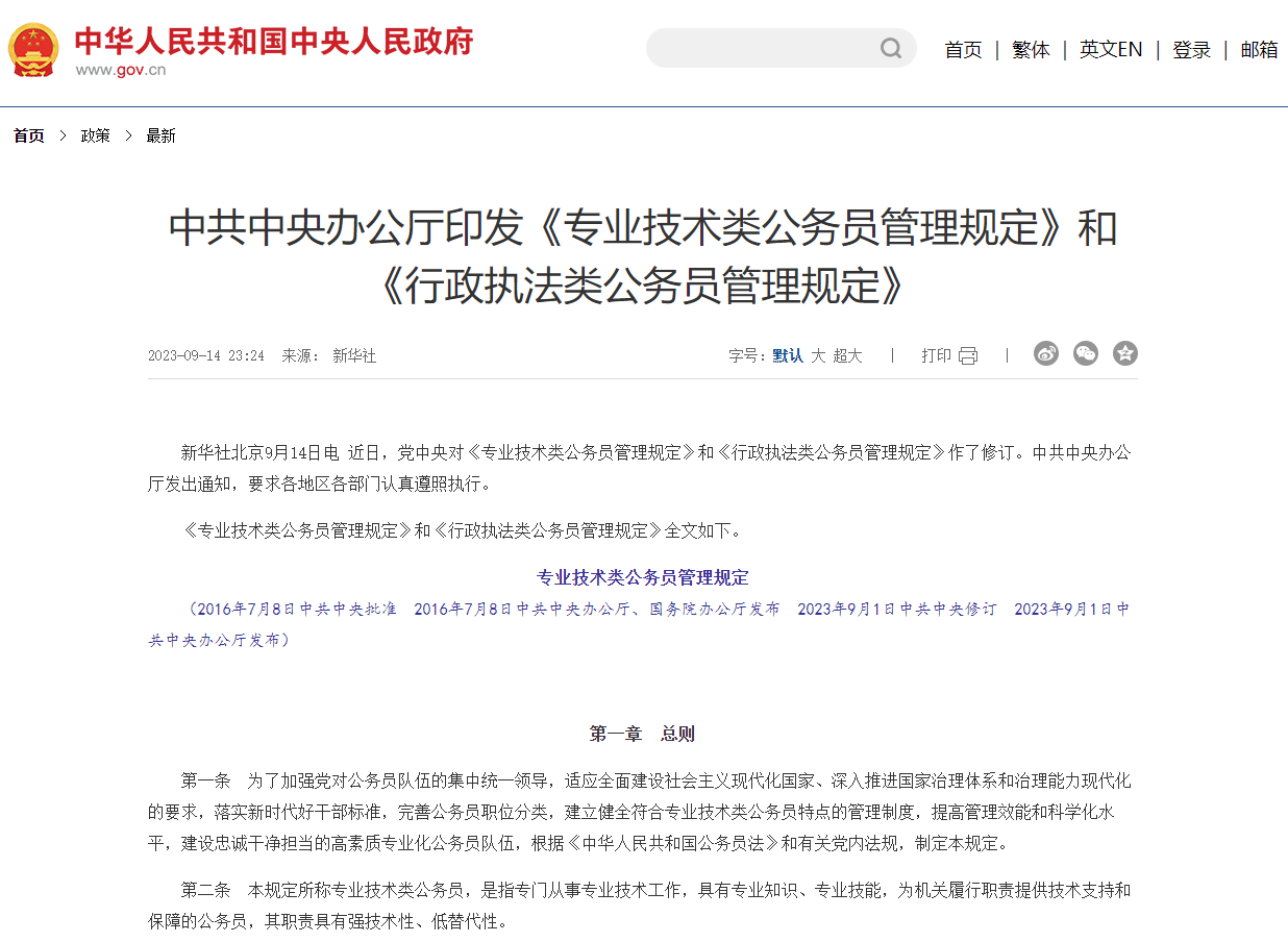 中共中央辦公廳印發(fā)《專業(yè)技術類公務員管理規(guī)定》和《行政執(zhí)法類公務員管理規(guī)定》