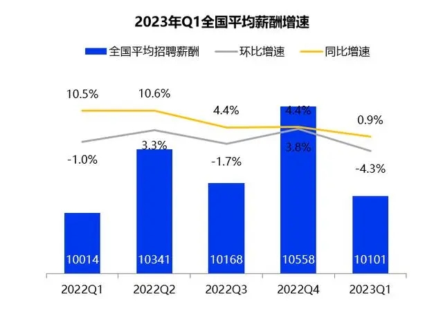 智聯(lián)招聘近日發(fā)布《中國企業(yè)招聘薪酬報告》,2023年一季度企業(yè)平均招聘薪酬為10101元 月,同比小幅上升0 9%;一季度薪酬較2022年四季度的105 ...