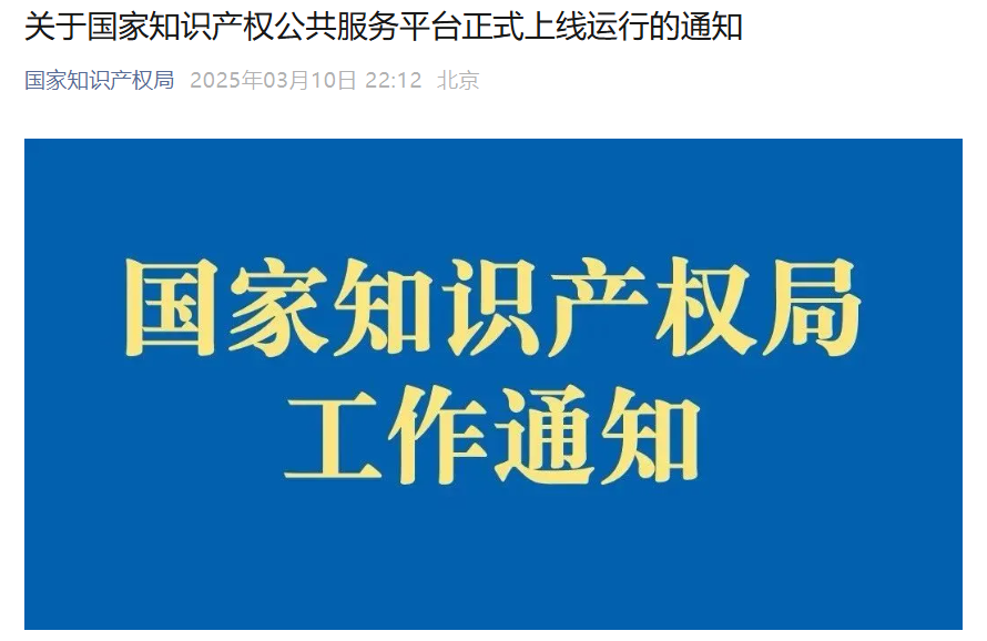 國家知識產(chǎn)權(quán)局發(fā)布《關(guān)于國家知識產(chǎn)權(quán)公共服務(wù)平臺正式上線運(yùn)行的通知》,平臺定于2025年3月10日正式上線。附通知內(nèi)容如下:各省、自治區(qū) ...