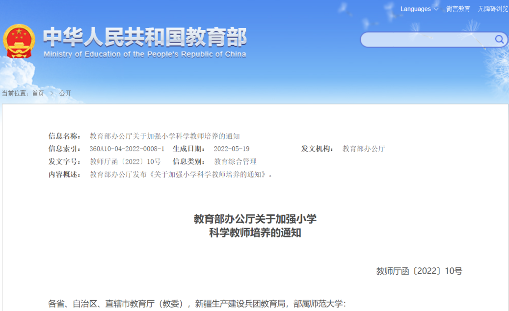 近日,教育部發(fā)布《關于加強小學科學教師培養(yǎng)的通知》(下簡稱《通知》),提出要建強一批培養(yǎng)小學科學教師的師范類專業(yè),從源頭上加強本科及 ...