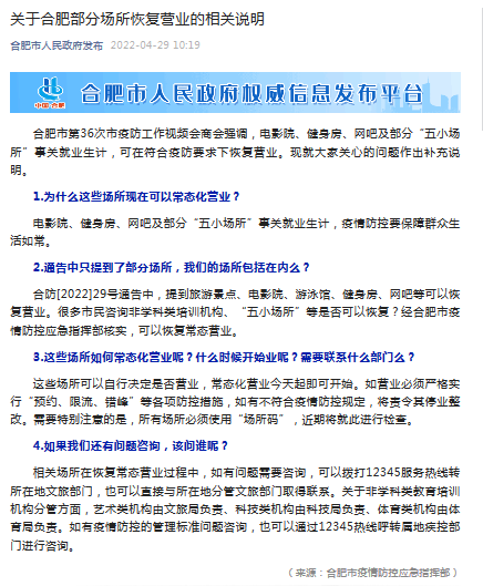 據(jù)合肥市人民政府發(fā)布微信號(hào)消息,合肥市第36次市疫防工作視頻會(huì)商會(huì)強(qiáng)調(diào),電影院、健身房、網(wǎng)吧及部分“五小場(chǎng)所”事關(guān)就業(yè)生計(jì),可在符合 ...