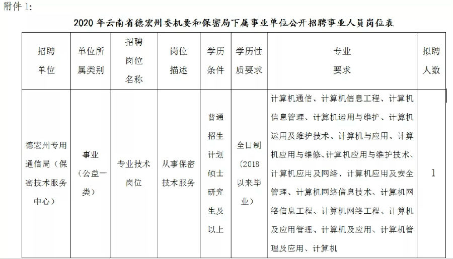 1.2020年云南省德宏州委機(jī)要和保密局下屬事業(yè)單位公開(kāi)招聘事業(yè)人員崗位表