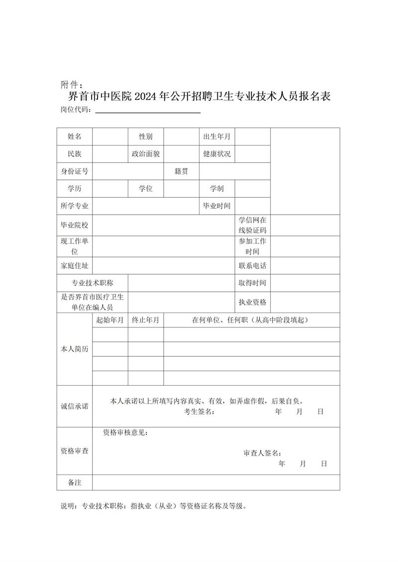 (2)郵箱投遞方式報名,郵箱地址:2778854289@qq.com,格式要求:以“崗位+姓名+聯(lián)系電話”為郵件主題,填寫《界首市中醫(yī)院2024年公開招聘衛(wèi)生專業(yè)技術(shù)人員報名表》作為附件1,身份證(正反面)、本科和研究生畢業(yè)證和學(xué)位證、本科和碩士學(xué)籍在線驗(yàn)證報告(帶二維碼版)、資格證(或考試合格成績單)、執(zhí)業(yè)證、住院醫(yī)師規(guī)范化培訓(xùn)合格證書(住院醫(yī)師規(guī)范化培訓(xùn)證明)、就業(yè)生推薦表(應(yīng)屆生)、研究生期間成績單(應(yīng)屆生)等相關(guān)材料掃描成一個PDF作為附件2。