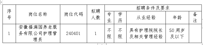 2024-05-13 11:31:42閱讀()安徽省盛岳保安服務(wù)集團(tuán)有限公司安徽省岳順人力資源服務(wù)有限公司是岳西縣縣屬一級國有企業(yè)盛岳集團(tuán)旗下的全資子公司。我公司充分了解客戶的行業(yè)特點、組織架構(gòu)、人才需求、員工培訓(xùn)等方面的需求,致力于為客戶提供定制化的人力資源服務(wù)方案,包括人才招聘、員工培訓(xùn)、勞務(wù)派遣、勞務(wù)外包等,旨在幫助客戶解決人力資源問題,提高組織效率,降低運營成本。盛岳·安徽福滿園養(yǎng)老服務(wù)有限公司委托我公司面向社會公開招聘工作人員,現(xiàn)將相關(guān)事項公告如下: