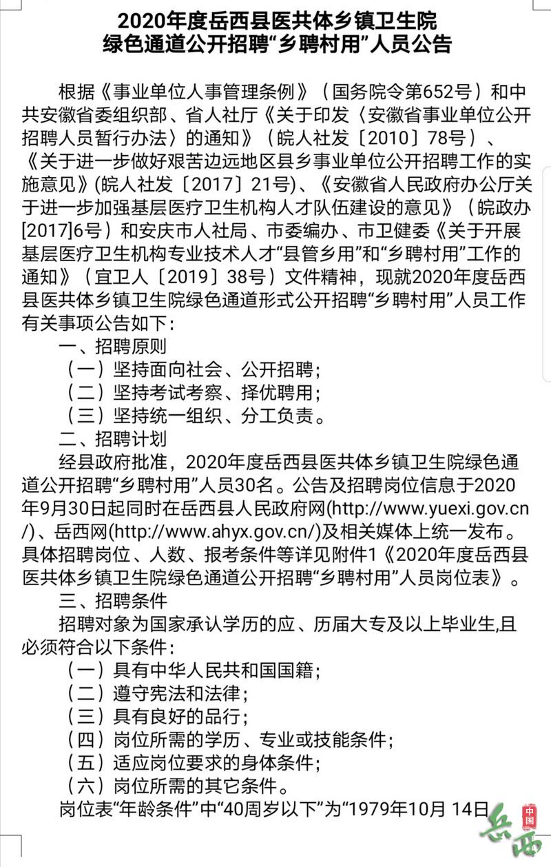 2020年安慶岳西縣醫(yī)共體鄉(xiāng)鎮(zhèn)衛(wèi)生院綠色通道公開招聘“鄉(xiāng)聘村用”人員公告