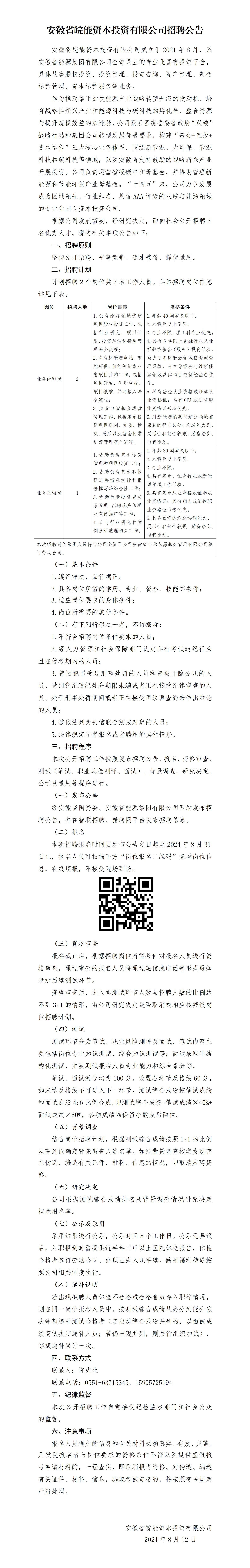 2024年安徽省皖能資本投資有限公司招聘公告