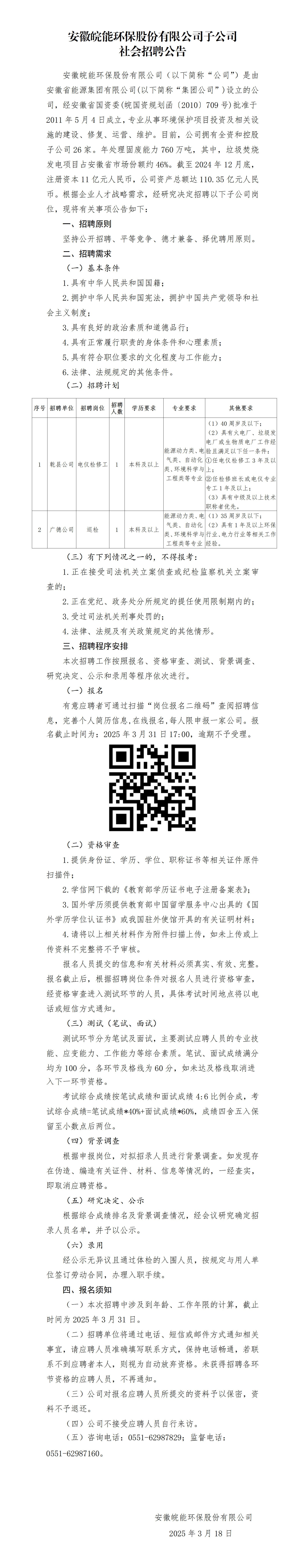 2025年安徽皖能環(huán)保股份有限公司子公司社會(huì)招聘公告