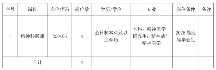 2025年度校園招聘衛(wèi)生專(zhuān)業(yè)技術(shù)人員4名,具體崗位信息詳見(jiàn)下表: