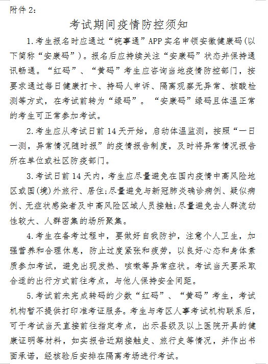 報(bào)考人員報(bào)名前,應(yīng)通過“皖事通”APP實(shí)名申領(lǐng)“安康碼”。報(bào)考人員報(bào)考前請(qǐng)認(rèn)真閱讀《考試期間疫情防控須知》(附件2)。報(bào)考人員提供的信息必須與本人實(shí)際情況、報(bào)考條件和所報(bào)考的崗位要求相一致。凡弄虛作假通過資格審查,其實(shí)際情況與報(bào)考條件規(guī)定不符的,一經(jīng)查實(shí),即取消考試、聘用等資格。