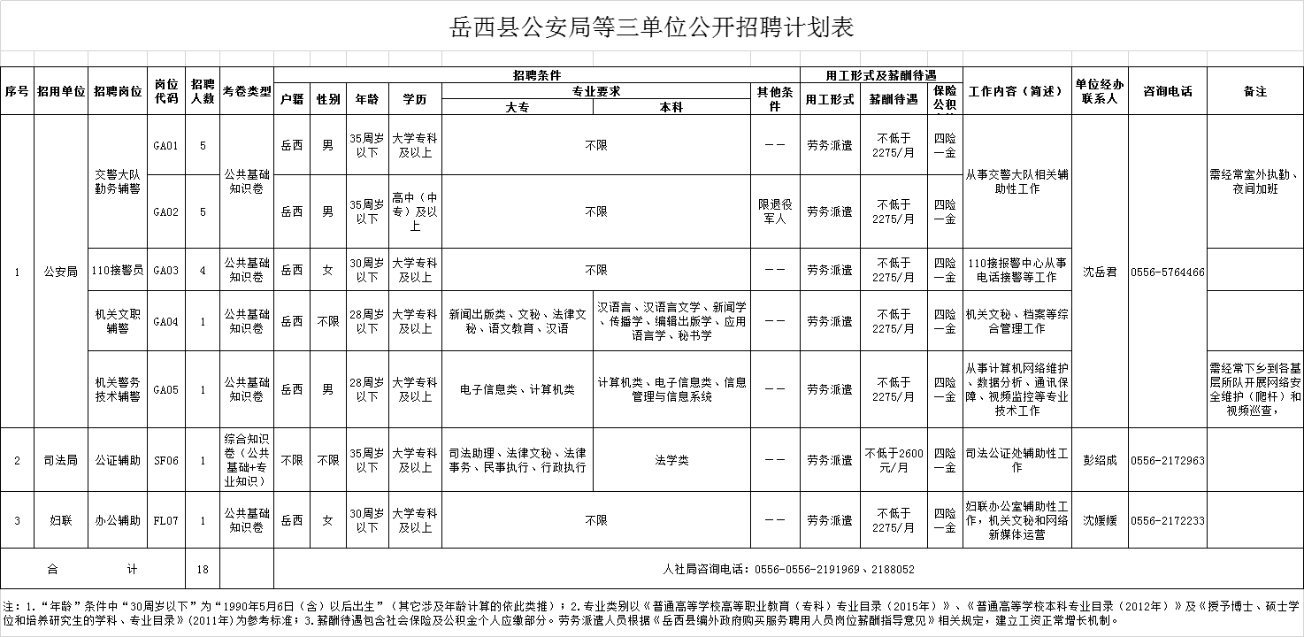 本次招聘工作人員18名,公告及招聘崗位信息于2021年4月23日起同時在岳西縣人事考試網(wǎng)(http://114.55.34.241:38887/)、岳西縣人民政府網(wǎng)信息公開(www.yuexi.gov.cn)、岳西縣公共就業(yè)人才服務(wù)網(wǎng)(www.yxjyw.org.cn)、岳西網(wǎng)(www.ahyx.gov.cn)及相關(guān)媒體上統(tǒng)一發(fā)布。具體招聘崗位、人數(shù)、報考條件及薪酬待遇等詳見附件1《岳西縣公安局等三單位公開招聘計(jì)劃表》。