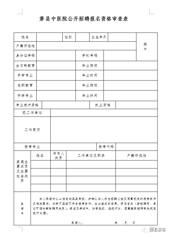 3、資格審查:報名的同時進行資格審查,提供本人身份證、畢業(yè)證(應(yīng)屆生提供就業(yè)推薦表)、學歷證書電子注冊備案表(學信網(wǎng)打印)、學士證、執(zhí)業(yè)資格證、專業(yè)技術(shù)資格證等材料,上述證件和證明材料均要求提供原件和復印件及小2寸近期免冠正面彩色照片4張,填寫《蕭縣中醫(yī)院公開招聘人員報名表》(表格自行下載打印),每人只能選擇一個崗位報考。