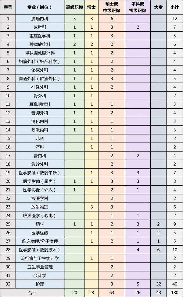 在中科院和安徽省暨合肥市的大力支持下,一所1500張床位的高水平、現(xiàn)代化三級甲等腫瘤??漆t(yī)院(高新院區(qū))正在建設(shè)中,根據(jù)醫(yī)院發(fā)展規(guī)劃,現(xiàn)面向全社會公開招聘各類專業(yè)技術(shù)人才,2020年人才招聘計劃如下: