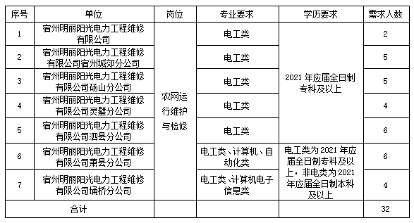 宿州明麗陽光電力維修工程有限責(zé)任公司(以下簡(jiǎn)稱公司)是國(guó)網(wǎng)宿州供電公司產(chǎn)業(yè)單位,主要受托開展宿州地區(qū)所屬鄉(xiāng)鎮(zhèn)10千伏及以下配網(wǎng)設(shè)備現(xiàn)場(chǎng)巡檢維護(hù)、故障搶修,0.4千伏及以下客戶服務(wù)業(yè)務(wù)。根據(jù)公司發(fā)展需求,現(xiàn)面向社會(huì)公開招聘。