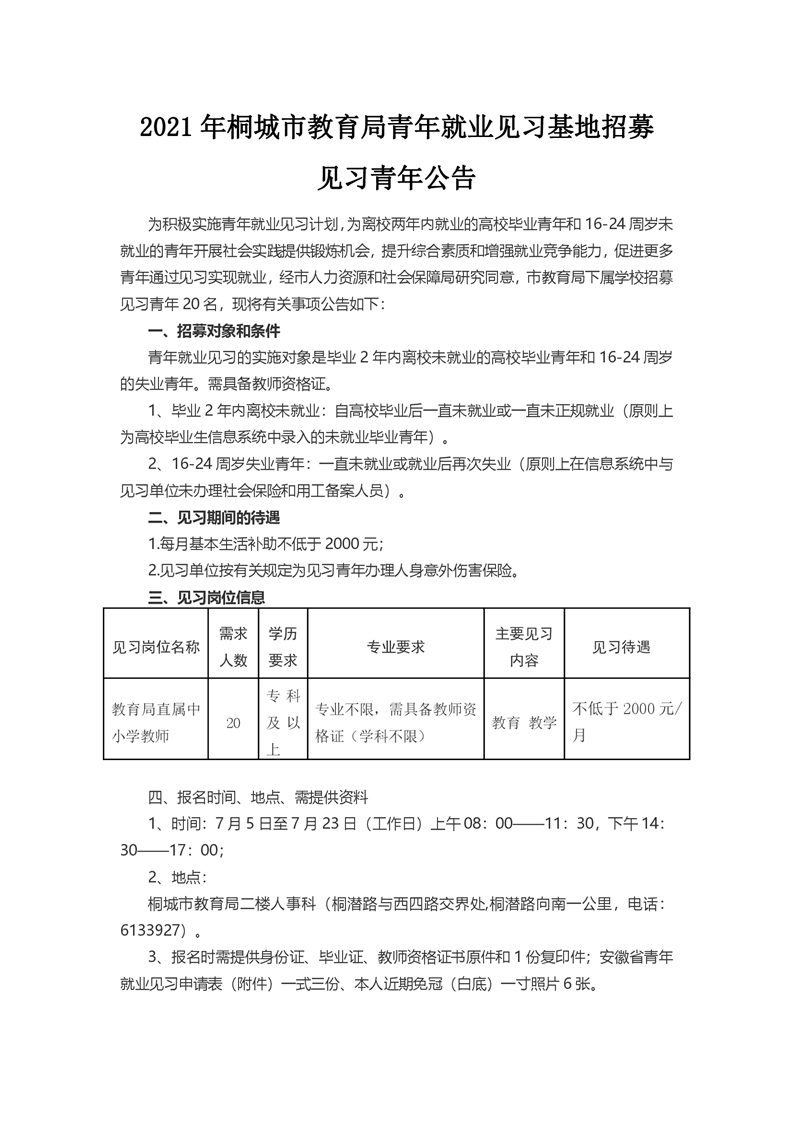2021-06-29 22:58:55閱讀()桐城市人民政府為積極實(shí)施青年就業(yè)見(jiàn)習(xí)計(jì)劃,為離校兩年內(nèi)就業(yè)的高校畢業(yè)青年和16-24周歲未就業(yè)的青年開(kāi)展社會(huì)實(shí)踐是供鍛煉機(jī)會(huì),提升綜合素質(zhì)和增強(qiáng)就業(yè)競(jìng)爭(zhēng)能力,促進(jìn)更多青年通過(guò)見(jiàn)習(xí)實(shí)現(xiàn)就業(yè),經(jīng)市人力資源和社會(huì)保障局研究同意,市教育局下屬學(xué)校招募見(jiàn)習(xí)青年20名,現(xiàn)將有關(guān)事項(xiàng)公告如下: