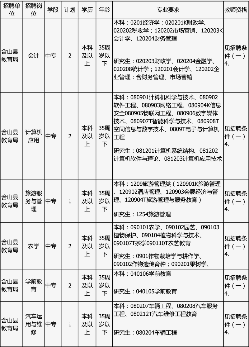 2021-07-21 17:54:50閱讀()含山縣人民政府根據(jù)《事業(yè)單位人事管理?xiàng)l例》(國(guó)務(wù)院令第652號(hào))、《事業(yè)單位公開招聘人員暫行規(guī)定》(原人事部令第6號(hào))和省委組織部、省人力資源和社會(huì)保障廳《關(guān)于印發(fā)〈安徽省事業(yè)單位公開招聘人員暫行辦法〉的通知》(皖人社發(fā)〔2010〕78號(hào))和中共安徽省委組織部、安徽省人力資源保障廳關(guān)于貫徹落實(shí)應(yīng)對(duì)新冠肺炎疫情影響做好事業(yè)單位公開招聘高校畢業(yè)生工作有關(guān)事項(xiàng)的通知》(皖人社秘〔2020〕73號(hào))規(guī)定和要求,落實(shí)中共含山縣委機(jī)構(gòu)編制委員會(huì)辦公室(含編辦函【2021】45號(hào))“關(guān)于同意縣電子工程學(xué)校緊缺專業(yè)教師引進(jìn)計(jì)劃的函”,現(xiàn)就含山電子工程學(xué)校2021年面向社會(huì)公開招聘專業(yè)課教師工作有關(guān)事項(xiàng)公告如下: