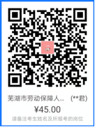 3. 掃碼繳費。應(yīng)聘者掃碼繳納報名費用45元。請用支付寶掃碼后添加備注,注明考生姓名、報考崗位。根據(jù)安徽省財政廳、安徽省物價局財綜〔2013〕2568號文件規(guī)定,按每人每科45元標(biāo)準(zhǔn)收取筆試費用。享受國家最低生活保障金城鎮(zhèn)家庭和農(nóng)村特困家庭的報考人員享受減免考試費用政策(先交后退,退費時需提供相關(guān)材料)。