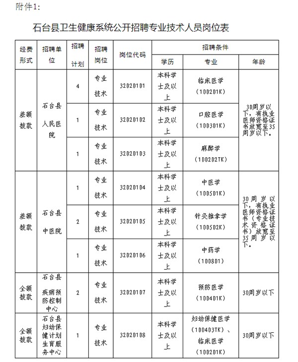 1、石臺(tái)縣衛(wèi)生健康系統(tǒng)公開(kāi)招聘專(zhuān)業(yè)技術(shù)人員崗位表