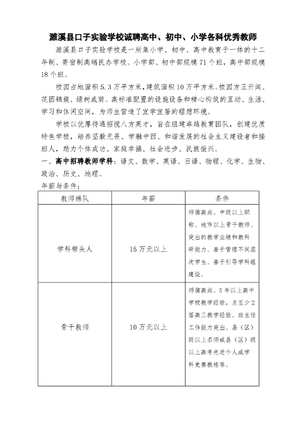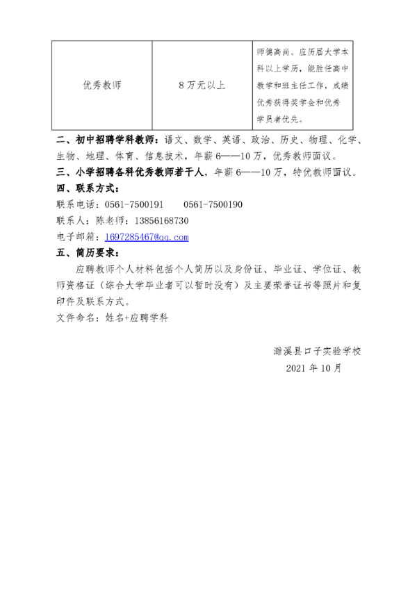 2021年淮北濉溪縣口子實驗學(xué)校誠聘高中、初中、小學(xué)各科優(yōu)秀教師
