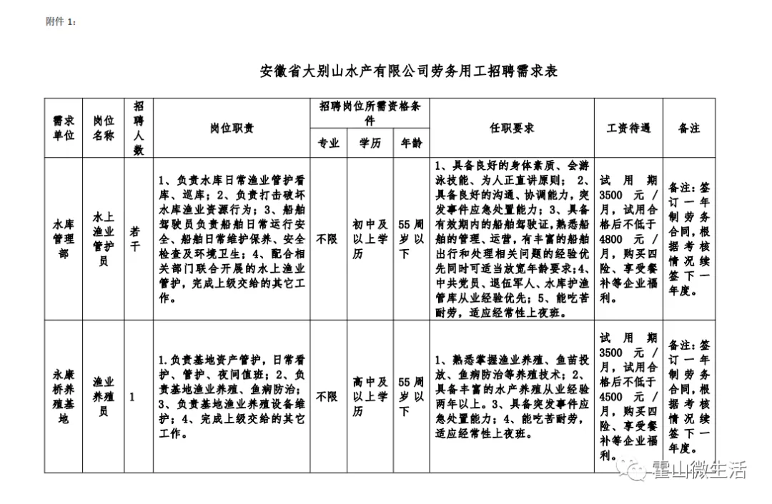 1、安徽省大別山水產有限公司勞務用工招聘需求表