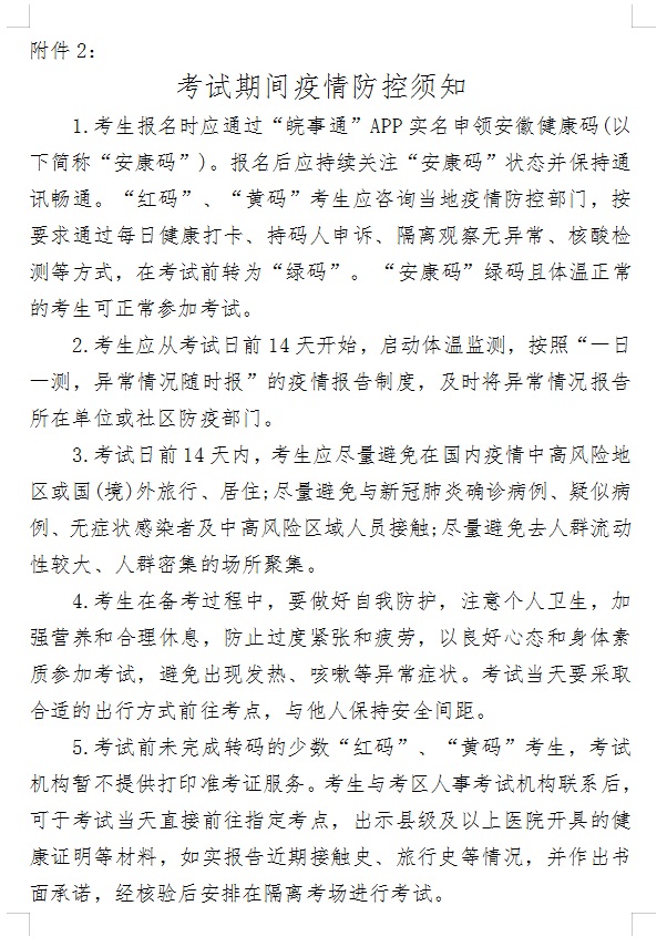 報考人員報名前,應(yīng)通過“皖事通”APP實名申領(lǐng)“安康碼”。報考人員報考前請認真閱讀《考試期間疫情防控須知》(附件2)。報考人員提供的信息必須與本人實際情況、報考條件和所報考的崗位要求相一致。凡弄虛作假通過資格審查,其實際情況與報考條件規(guī)定不符的,一經(jīng)查實,即取消考試、聘用等資格。