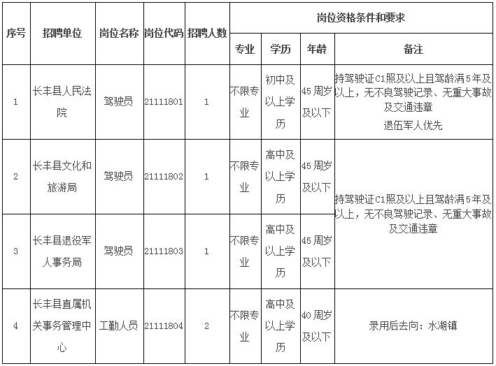根據(jù)工作需要和有關(guān)規(guī)定,長豐縣直屬機(jī)關(guān)事務(wù)管理中心委托遠(yuǎn)創(chuàng)人力資源管理集團(tuán)有限公司面向社會公開招聘駕駛員3名和工勤人員2名?,F(xiàn)將有關(guān)事項公告如下: