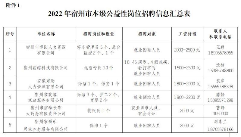 附件1:2022年宿州市本級(jí)公益性崗位招聘信息匯總表
